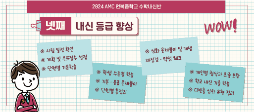 내신에 최적화된 최강 커리큘럼을 통하여, AMC의 성적향상 프로그램을 경험하시기 바랍니다.