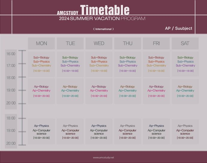 2024년 Summer Vacation Program의 과목들은 SAT Chemistry, Physics, Biology, English, AP Cal