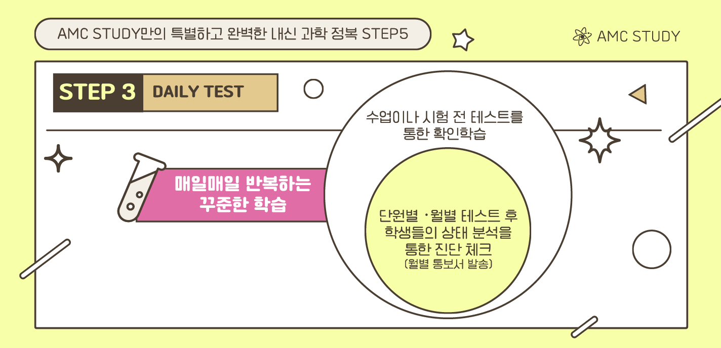 AMC학원 만의 완벽한 내신정복의 5단계는 과학공부의 개념정리와 이해과목의 정리에 있어서