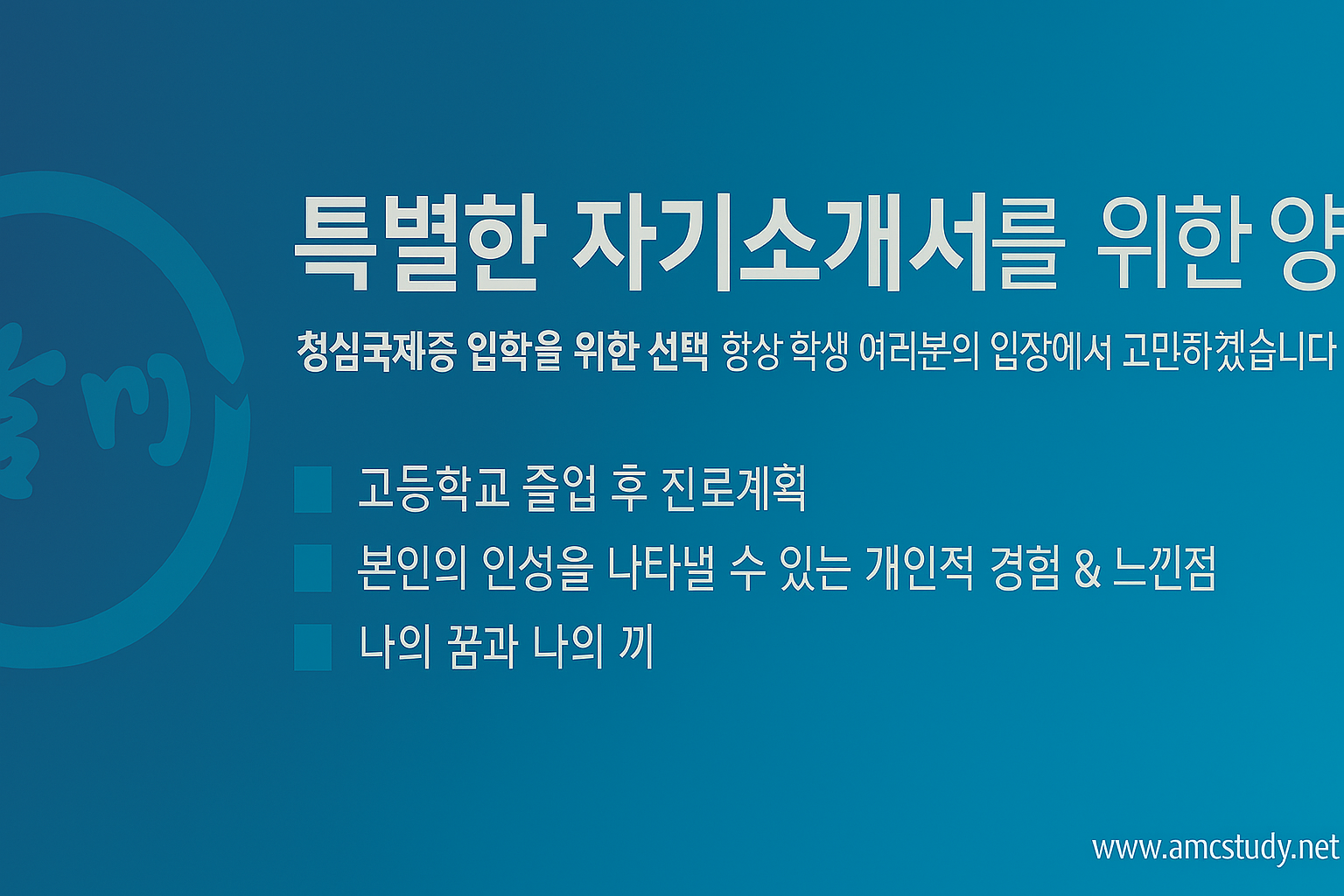 저희 amc학원은 청심 국제중학교 입학을 위하여 지금까지 다양한 자소서 준비를 해왔습니다.