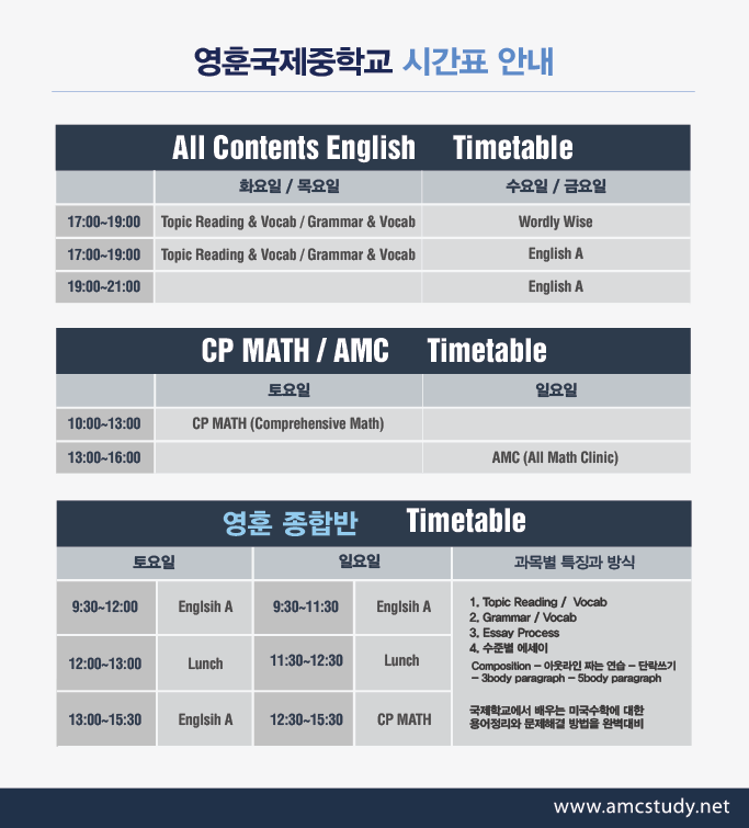 위의 영훈국제중 종합반 시간표를 참고해 주시기 바랍니다.