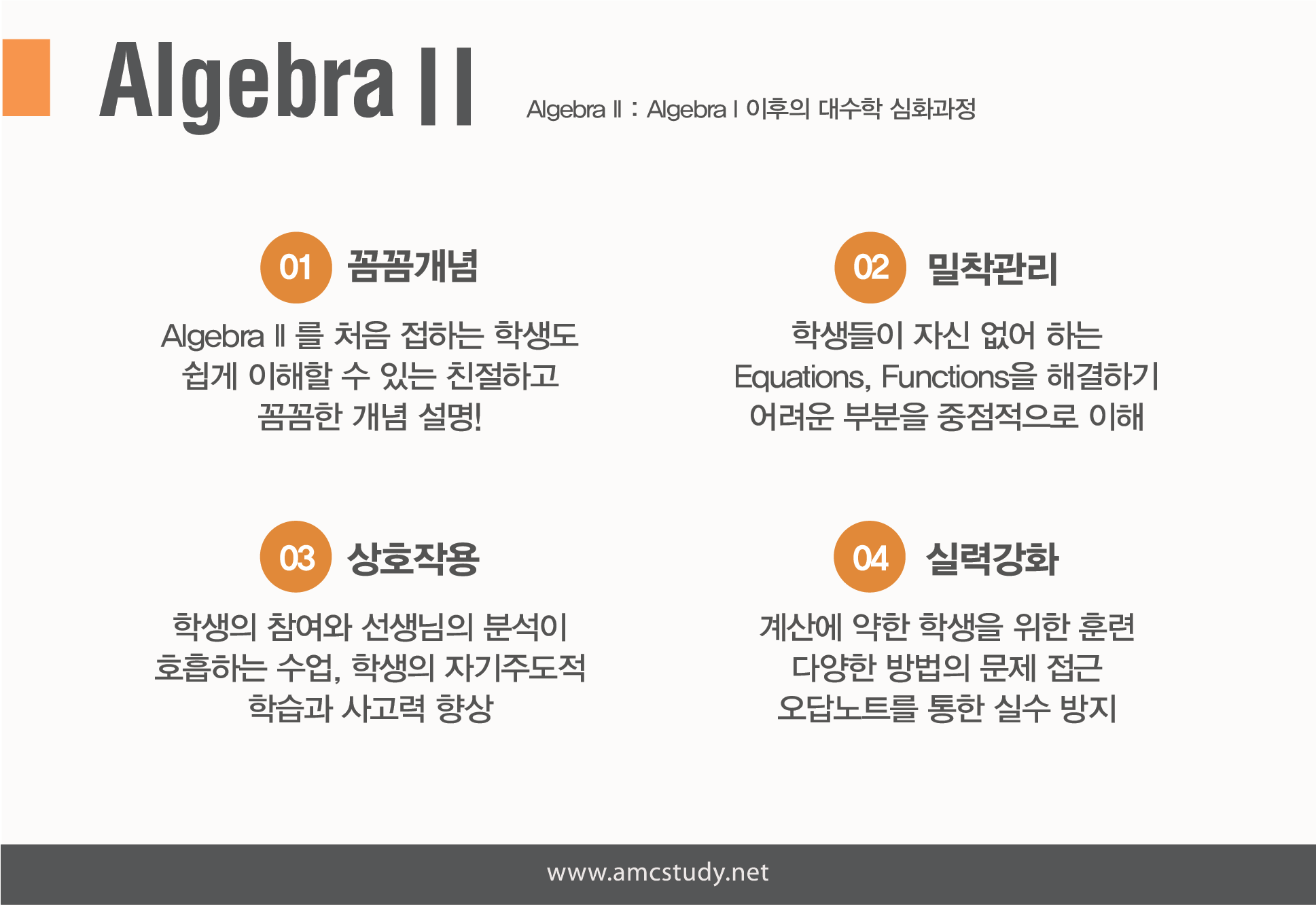 Algebra1에서 학습했던 단원들의 약 50% 정도가 복습이 되면서, 심화되고, 변형되게 됩니다.
