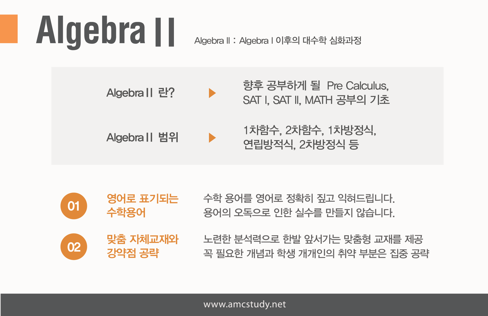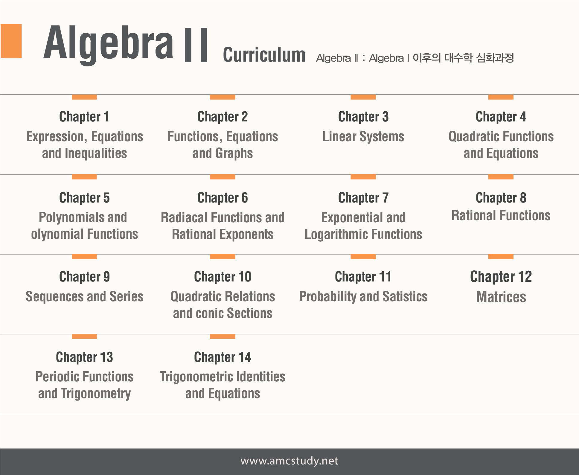 Algebra1에서 학습했던 단원들의 약 50% 정도가 복습이 되면서, 심화되고, 변형되게 됩니다.