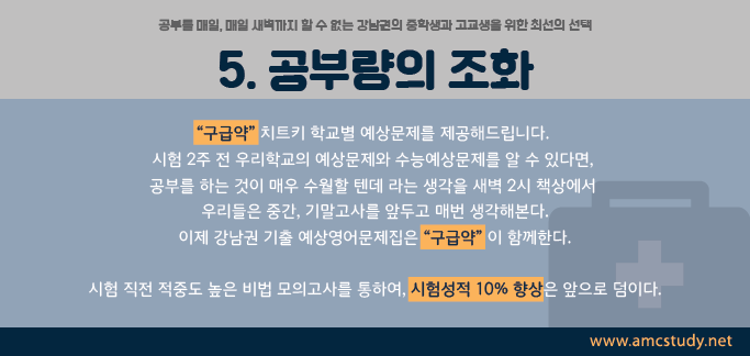 밀도 있고 체계화된 공부량과 더불어서 "구급약" 시리즈 내신 예상문제집을 통하여, 압구정고내신영어와
