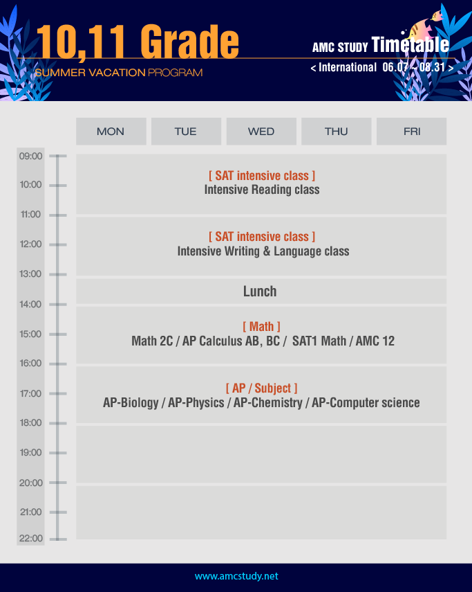 amc10은 월,수, 금 6시, amc12는 화,목,토 6시에 class가 진행되게 됩니다. 다른 기본과목을 공부하는 학