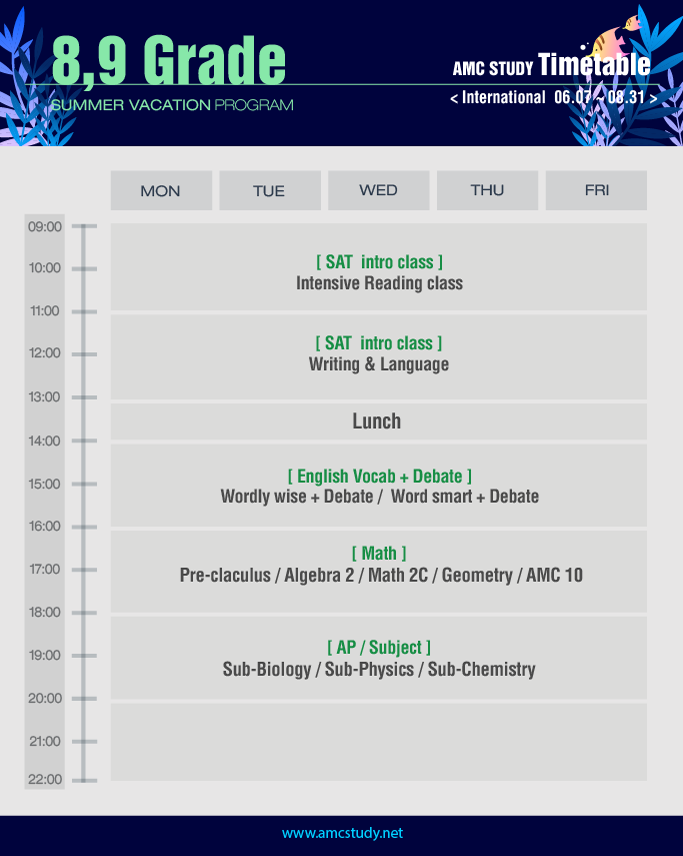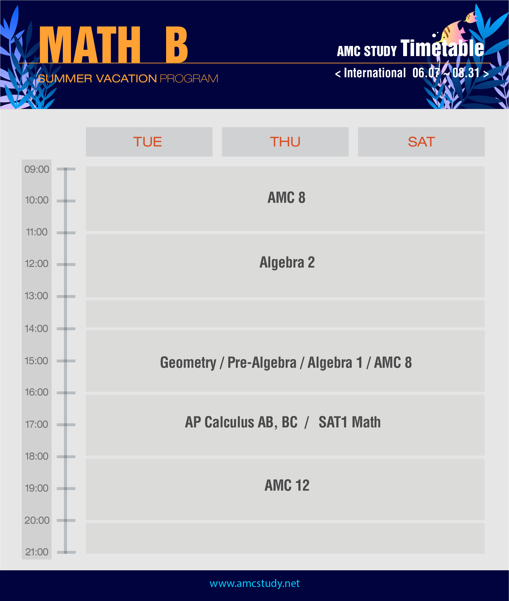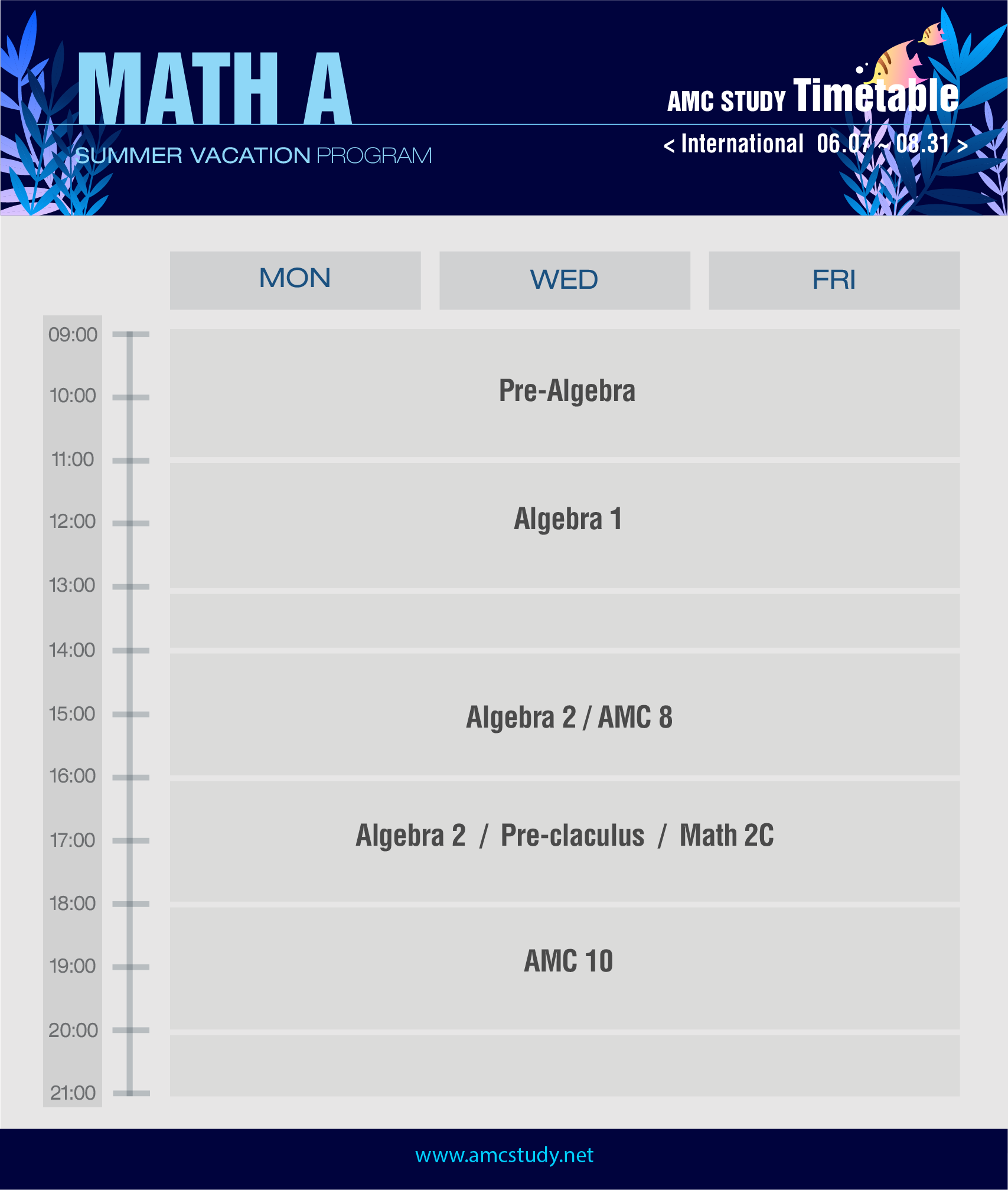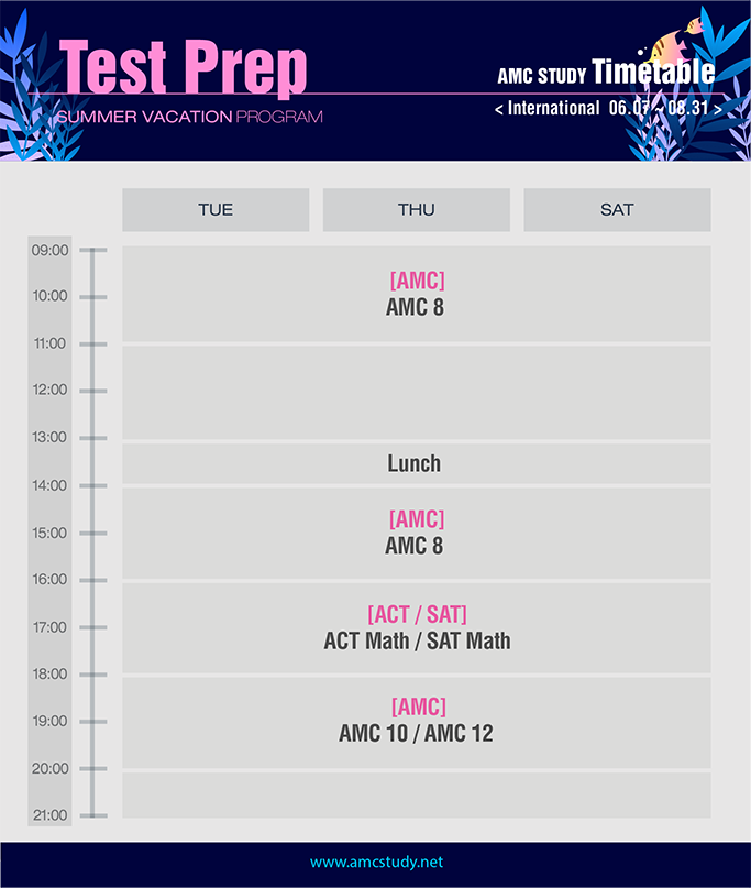 Amc8, amc10, amc12의 class는 월,수, 금 오전과 화,목,토의 오후 2시 ~ 4시에 수업이 진행 되게 됩니다.