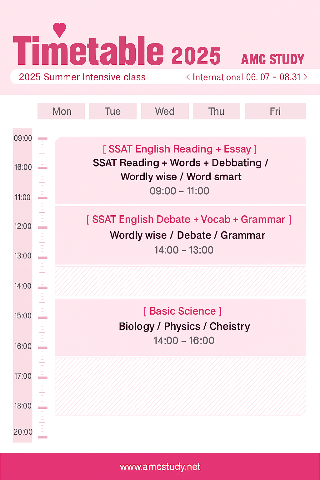 SSAT, SAT intro, SAT intensive class와 algebra1, algebra2, amc8, amc10, amc12