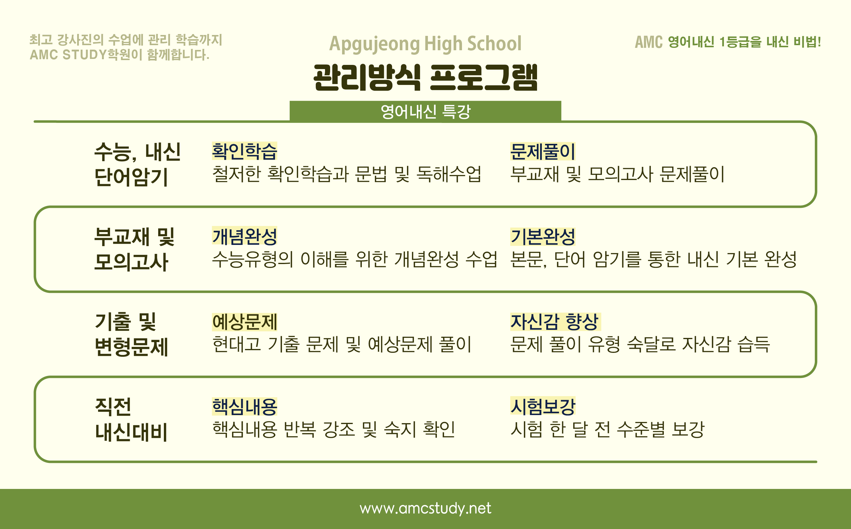 에서 공부한 내용과 관리학습으로 압구정고 영어내신준비의 80% 이상이 완료된다고 볼 수 있겠