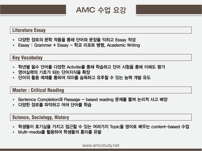 검증된 커리큘럼과 내부 자체교재 그리고 지금까지 현지 국제학교별 입학시험에서의 Essay와