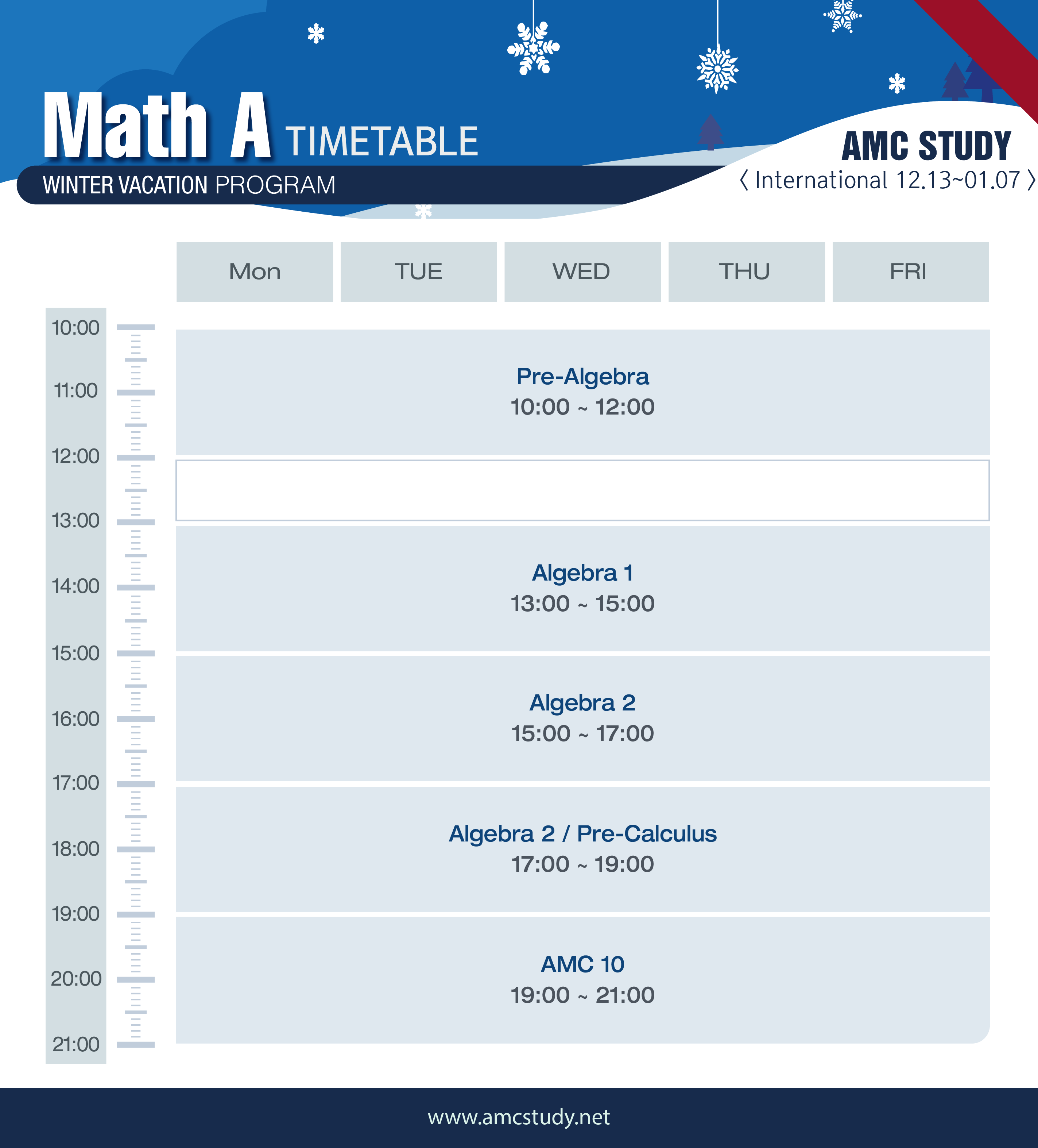 Pre calculus, 그리고 amc10의 과정으로 구성되어져 있습니다. 학생 여러분은 본인에게 꼭 필요한