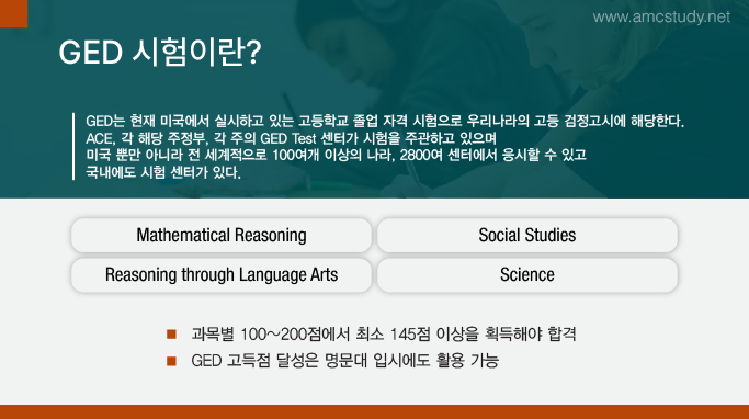 관심이 지속적으로 늘어나고 있는 것 같습니다. GED시험은 미국과 캐나다로 유학을 준비하는 학생들이 준비해야