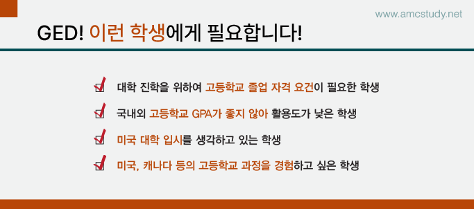 GED를 준비하는 경우는 한국에서 고등학교의 내신이 좋지 않은 상태에서 TOEFL과 SAT 혹은 ACT의 시험만을 보