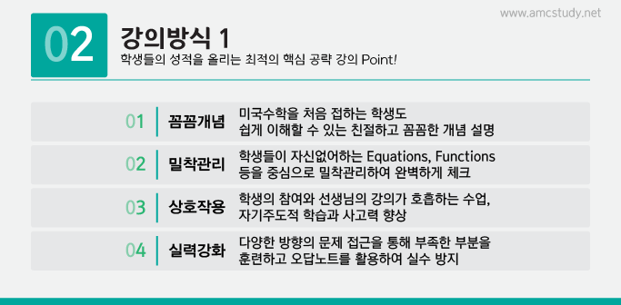 적인 개념 학습과 함께 미리 구성되어진 커리큘럼을 통하여 학생들에 대해서 최대한 맞춤학습을 가능하게 지도합니
