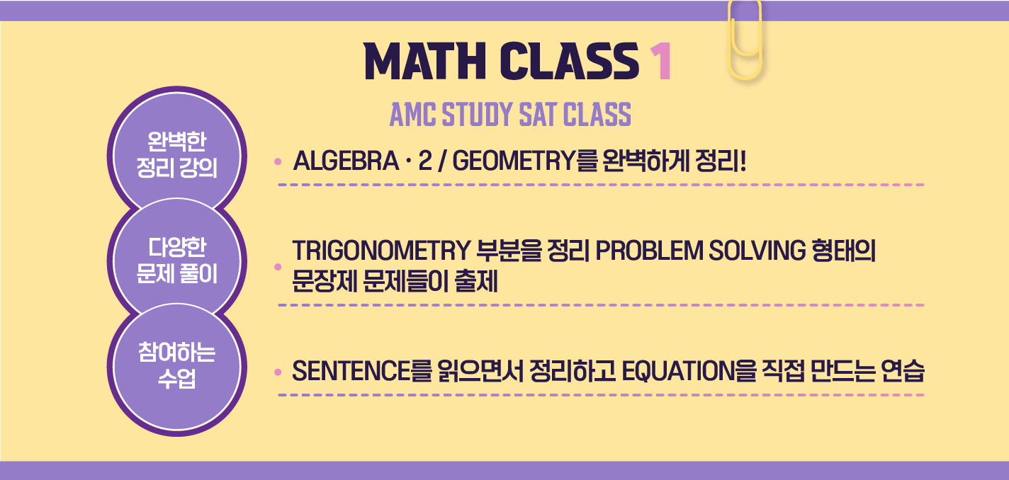 SAT math의 경우는 출제경향의 특성상 Algebra2와 Geometry의 기초수업을 병행 합니다. 이유는 기존