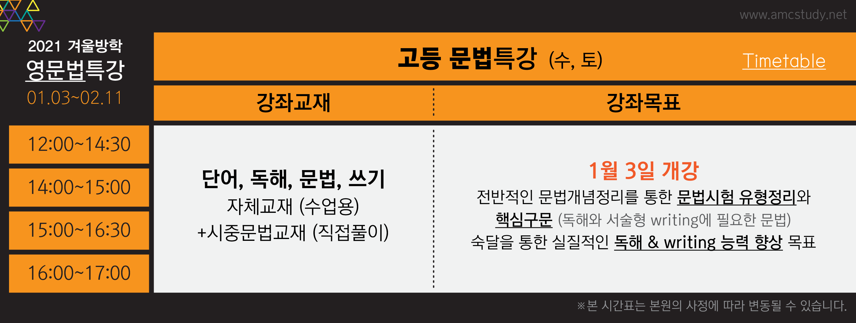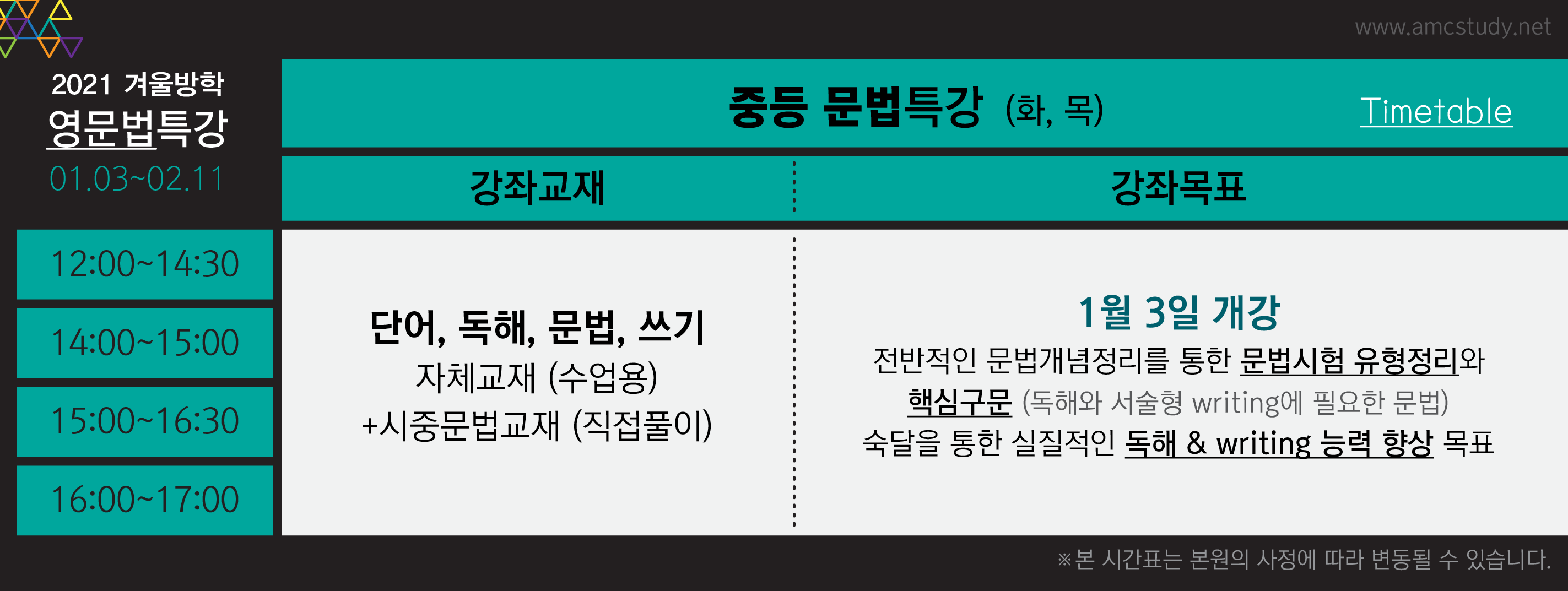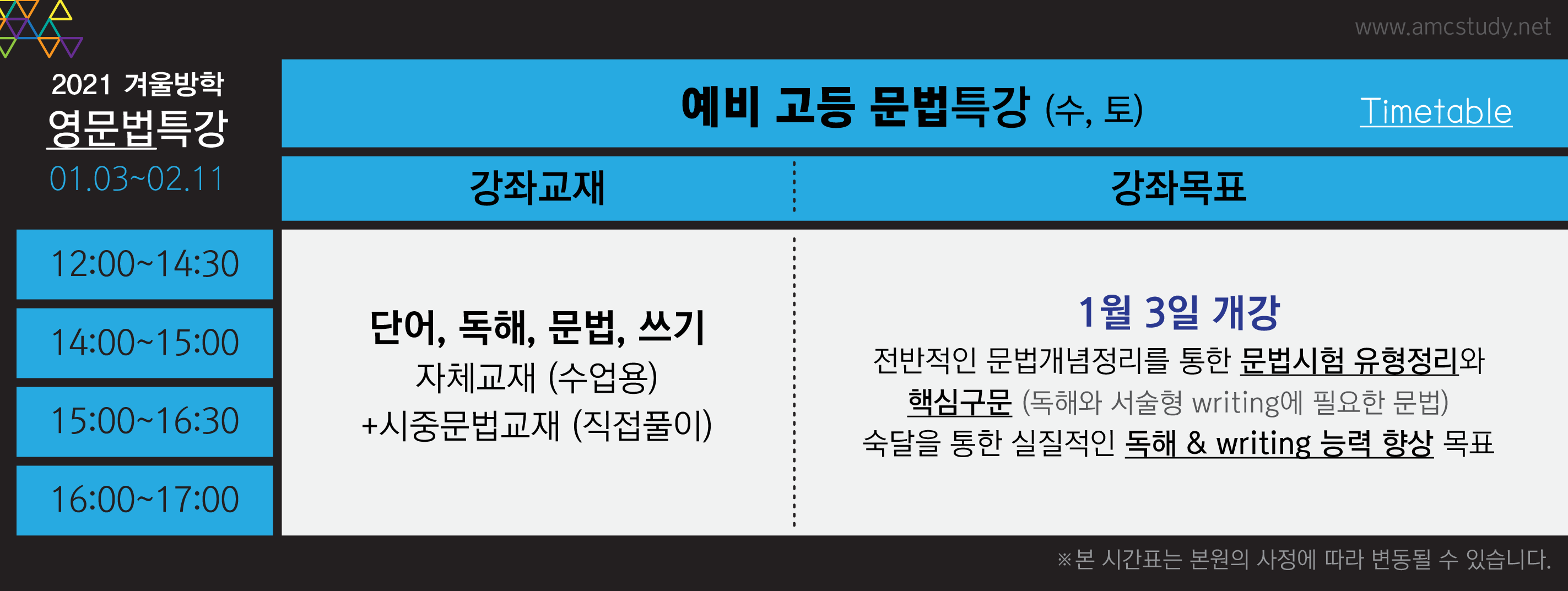| 2022 겨울방학특강 / 영문법특강 / 대치동영문법 / 압구정영문법 / 예비고영어 / 중3영문법특강 (0) | 2021.11.28 |