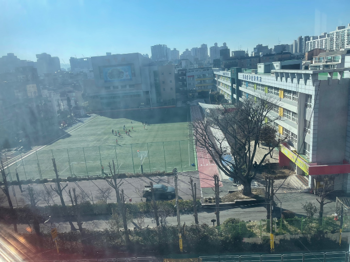 사회관 5층에서 신구초등학교의 모습이 잘보고이고 합니다. 잔디 운동장도 보입니다.