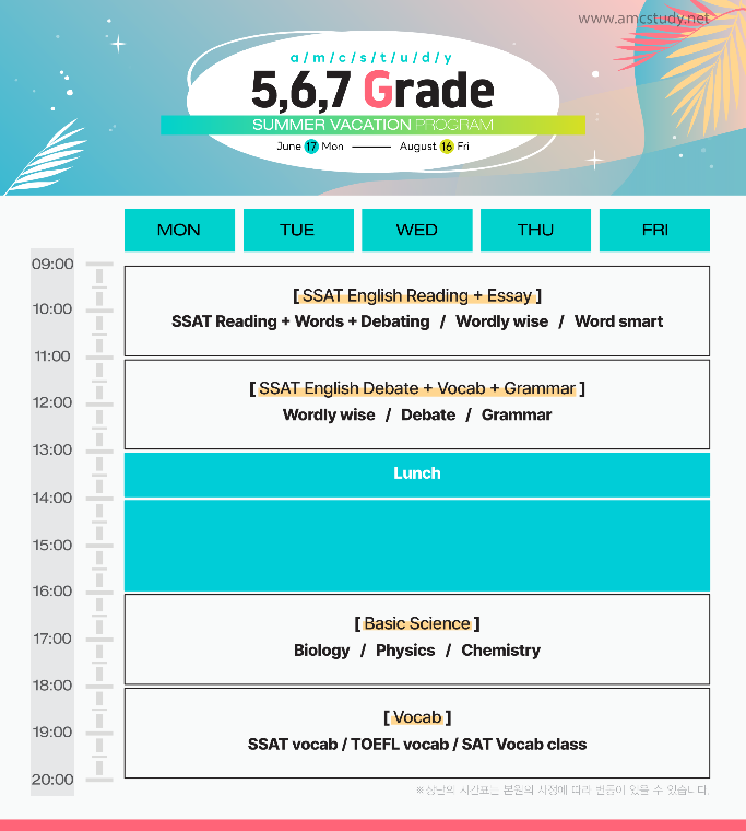 수업을 기반으로 하여, 오전에는 학생들의 level을 SSAT lower, SSAT middle, SSAT upper