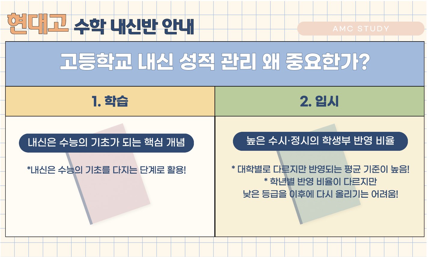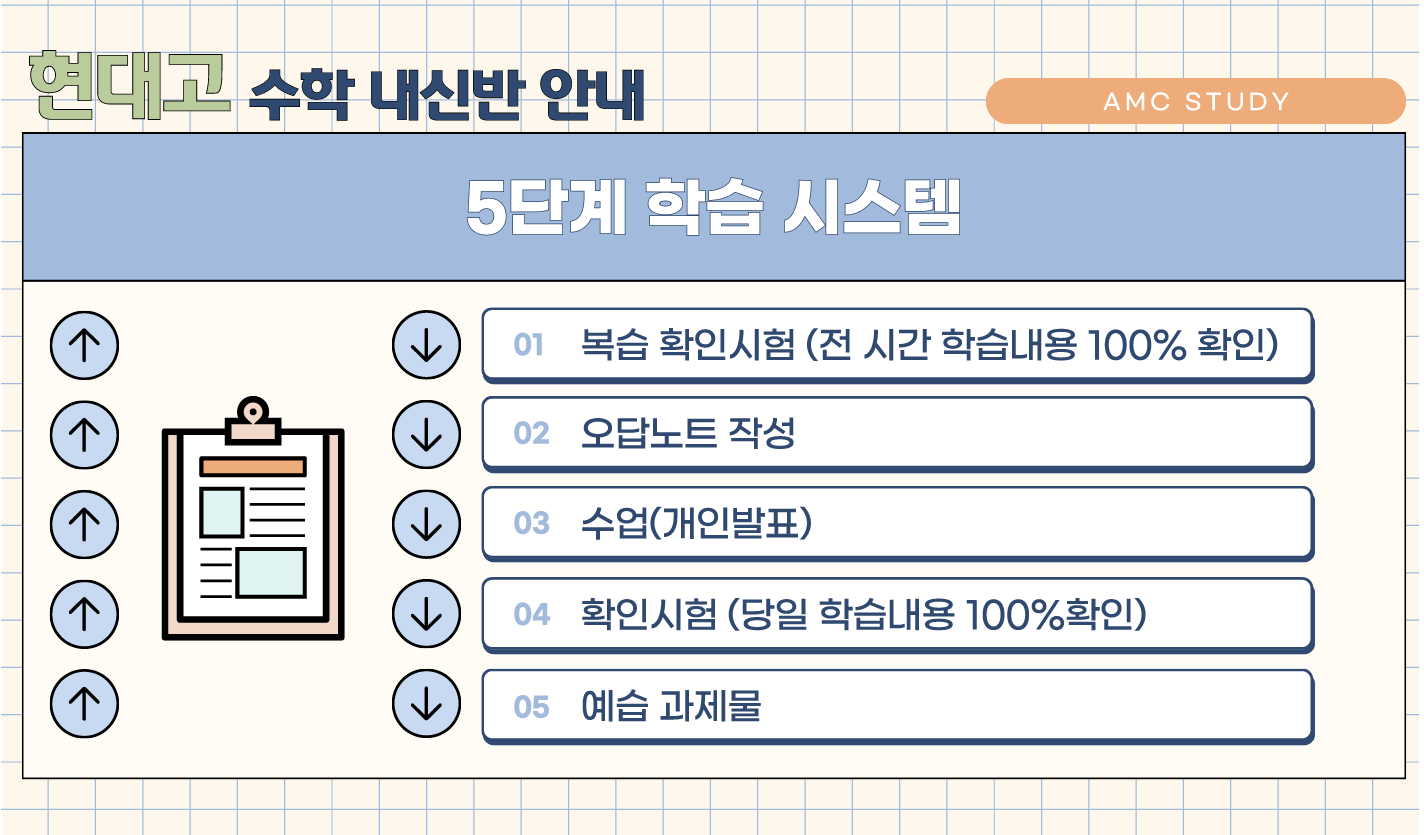 꼼꼼한 개념노트와 오답노트를 작성할수 있도록 amc학원의 여러선생님들은 현대고 여러분들과 함께 합니다.