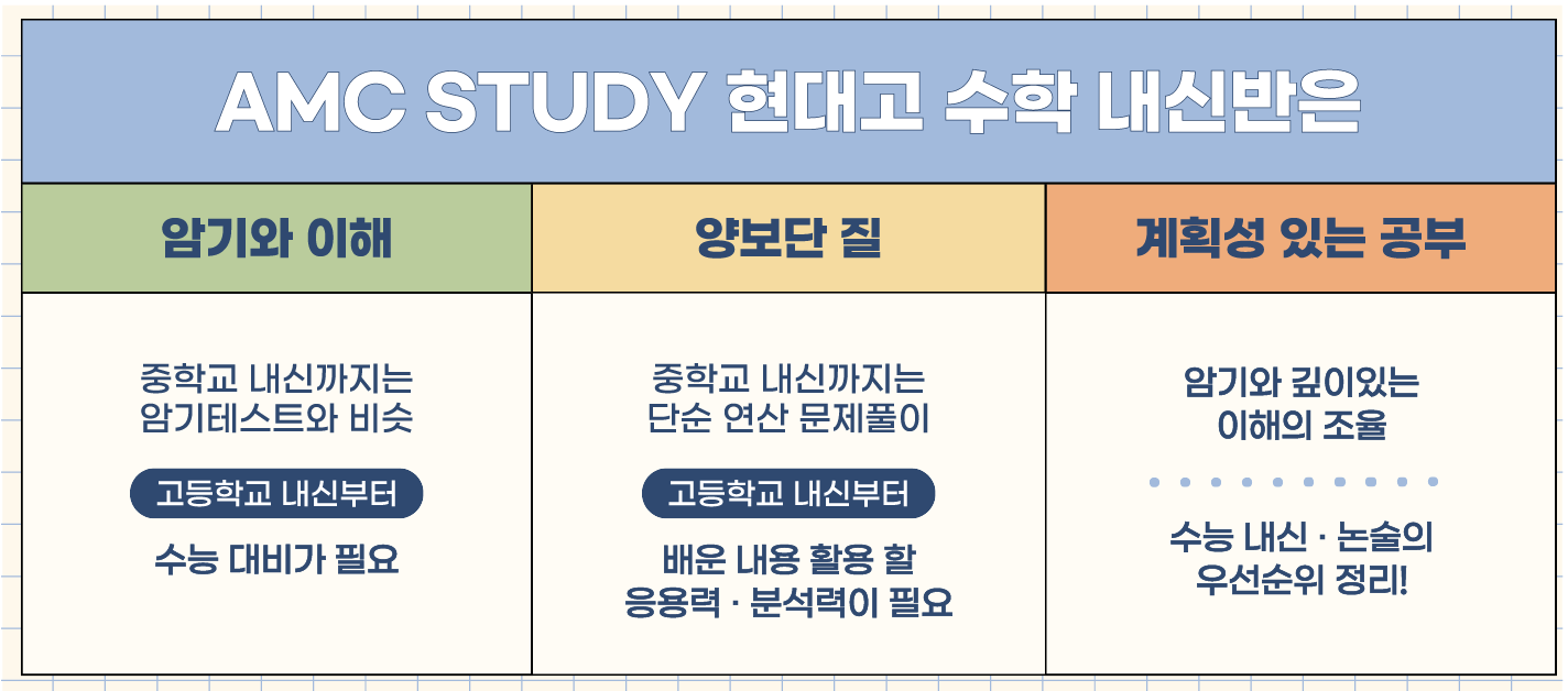 amc학원은 현대고 학생여러분들이 성적향상을 기본으로 하여, 내신, 수시 그리고 수능정시에서도 최고의 결과를