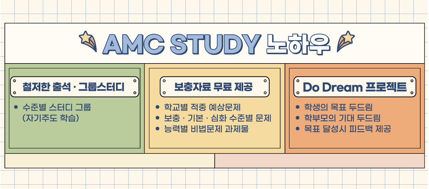 작년에 이어서 올해도 에이엠씨스터디를 성원해 주시는 학생여러분 감사드립니다. 저희학원은 과정에