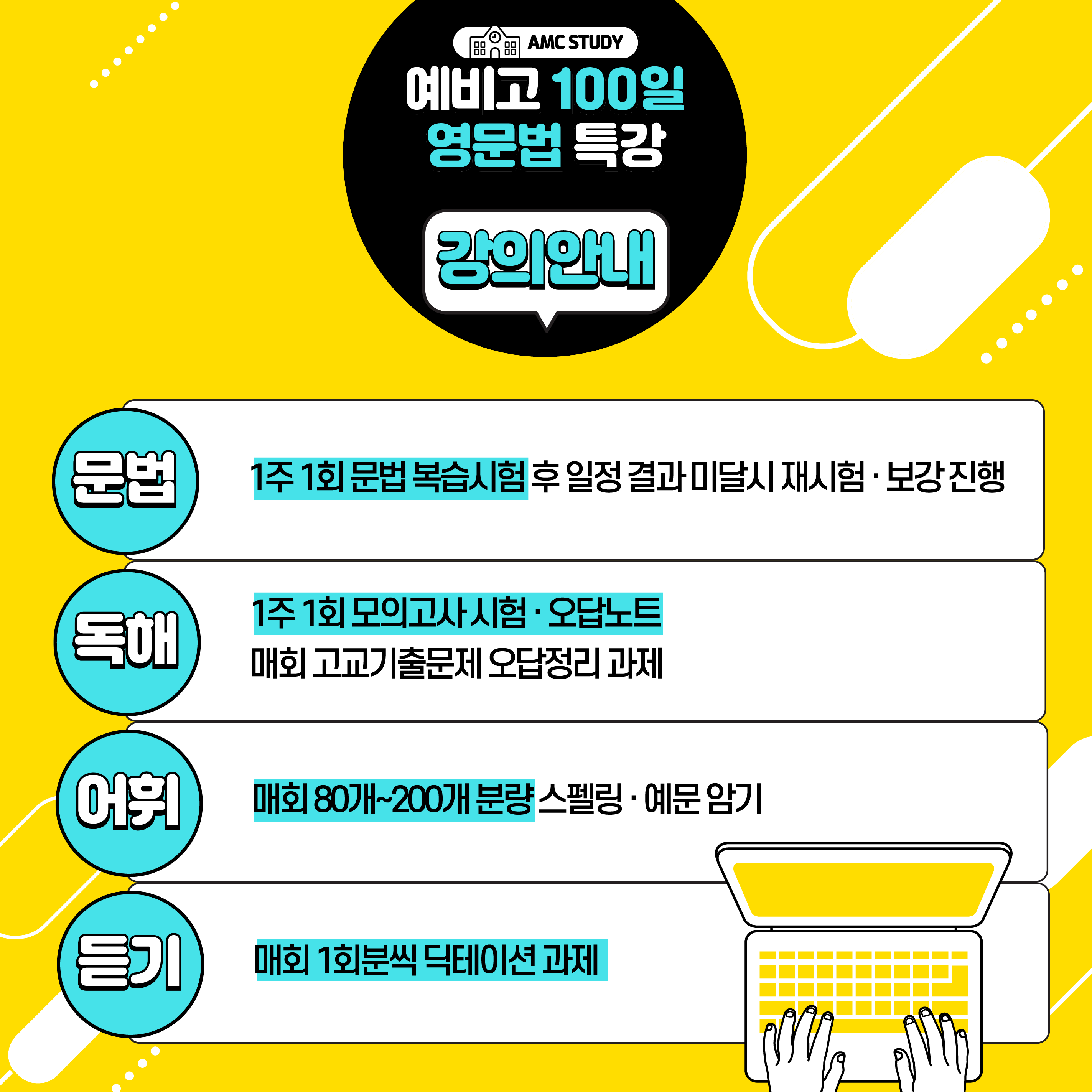저희 에이엠씨학원 에서는 예비고등학생들과 압구정고, 현대고, 경기고, 영동고, 휘문고의 학생들을 위한