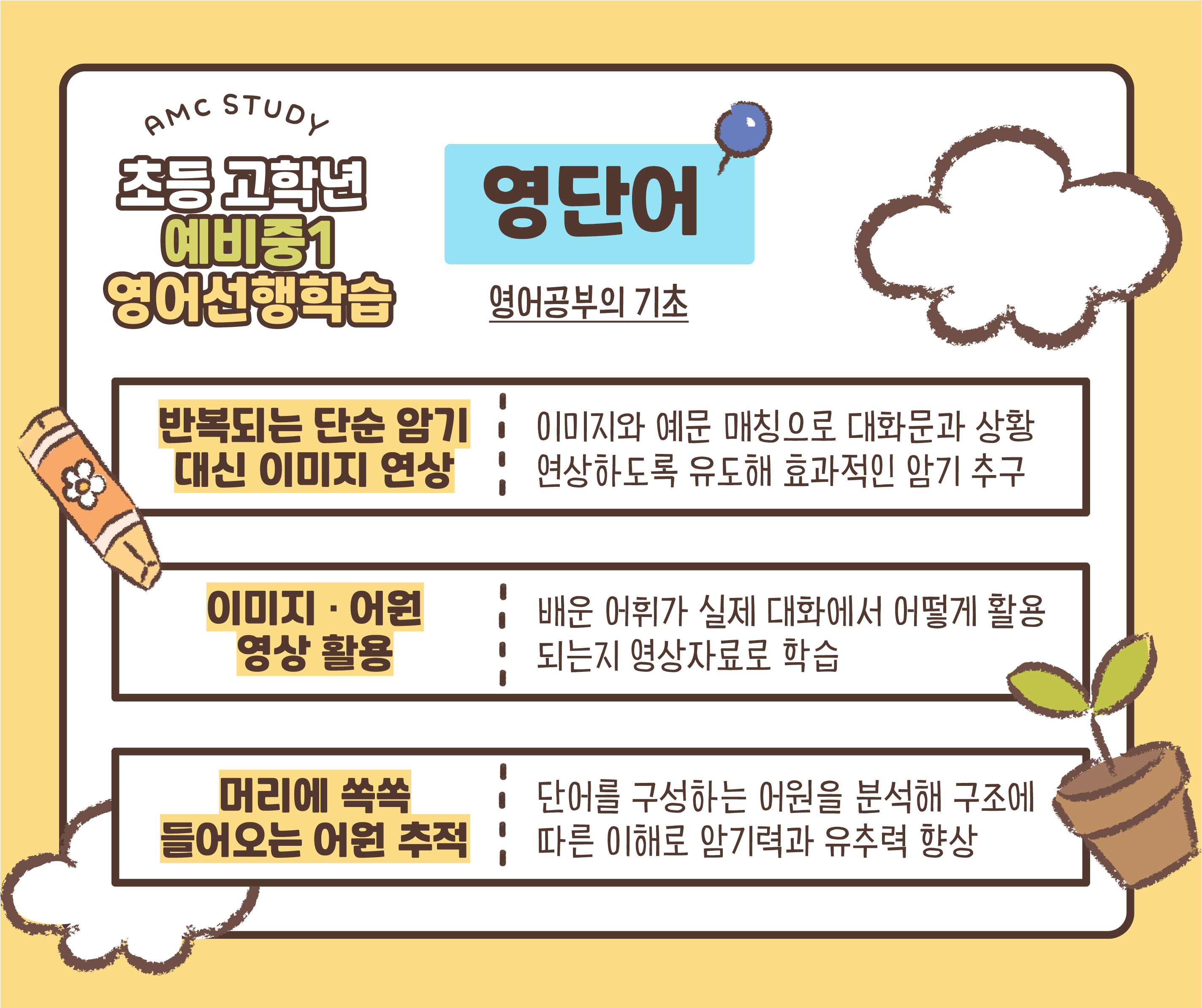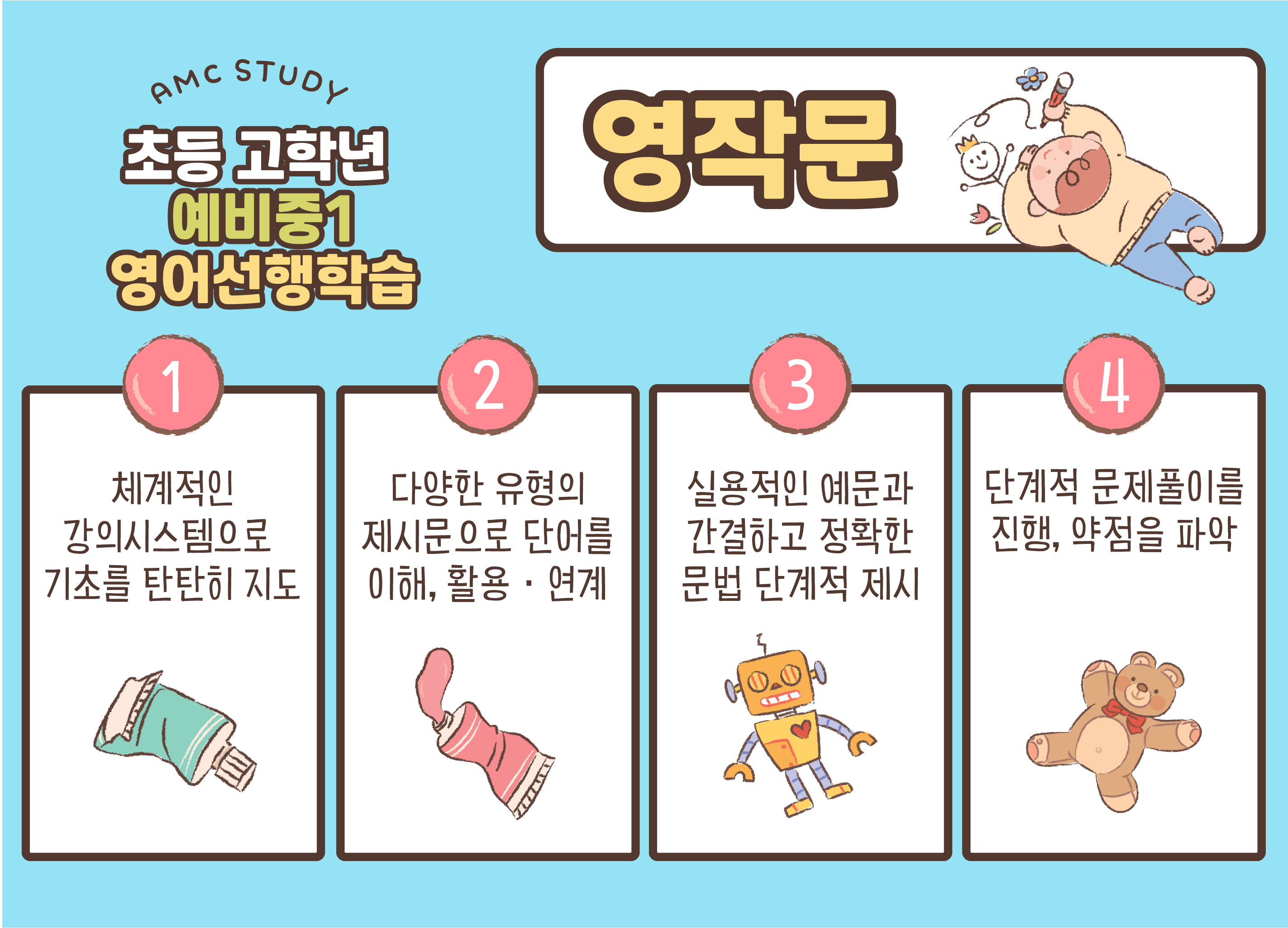 저희 amc학원 압구중영어학원과 신사중영어학원으로써 예비중학생들을 위한 기초영어에 핵심