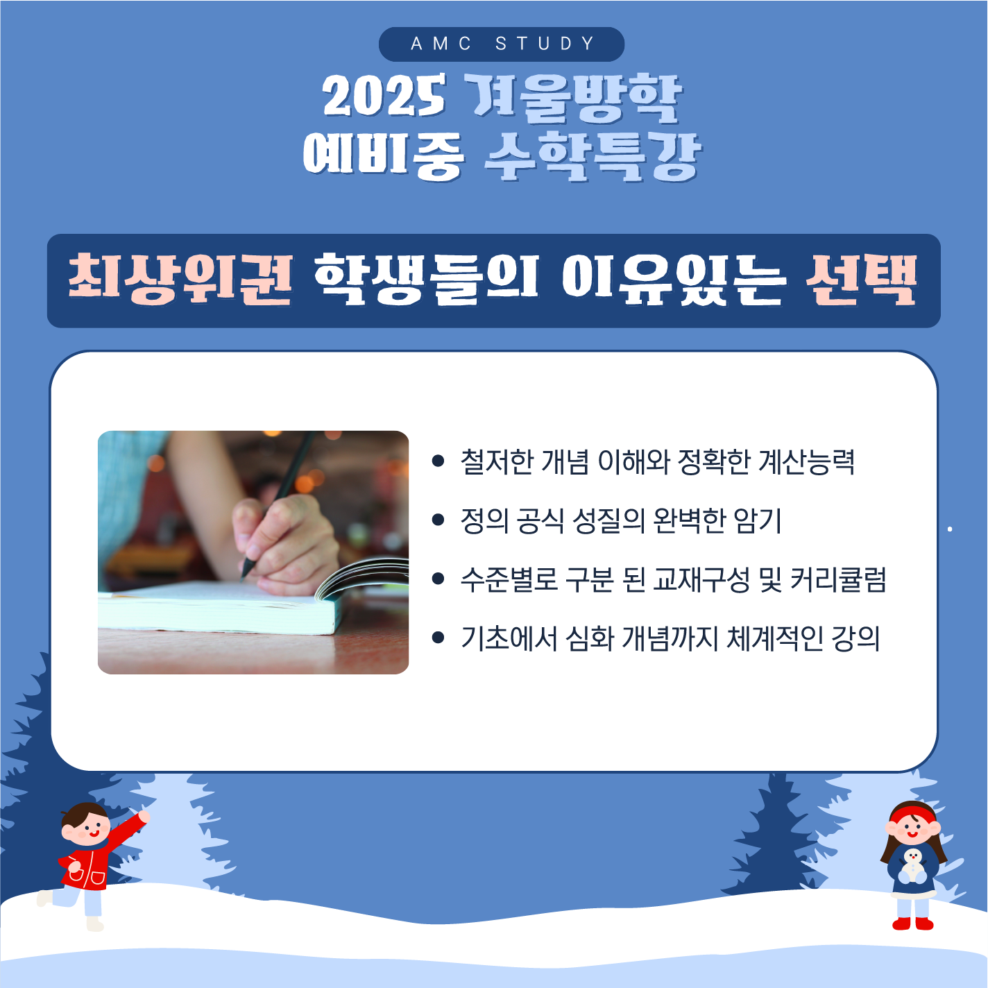 2025년 겨울방학을 맞이하여 예비중 학생들을 위한 알찬겨울방학특강을 제공해 드리게 되었습니다.