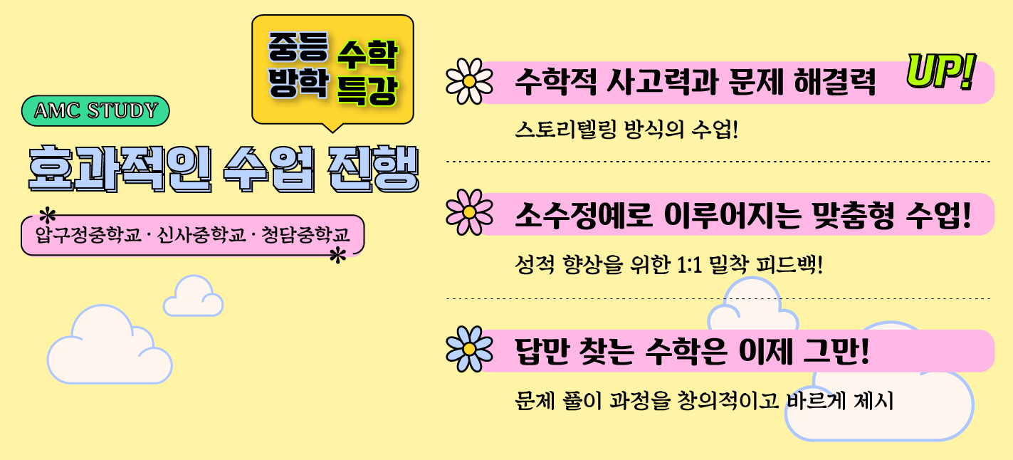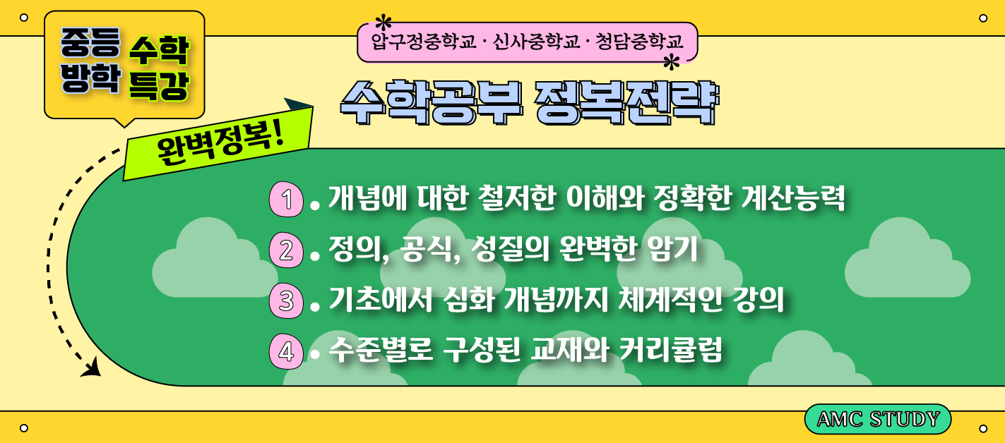 안녕하세요~! AMC학원의 초이샘 입니다. 2026년 겨울방학을 맞이하여 압구정권역의 중학생과 예비중