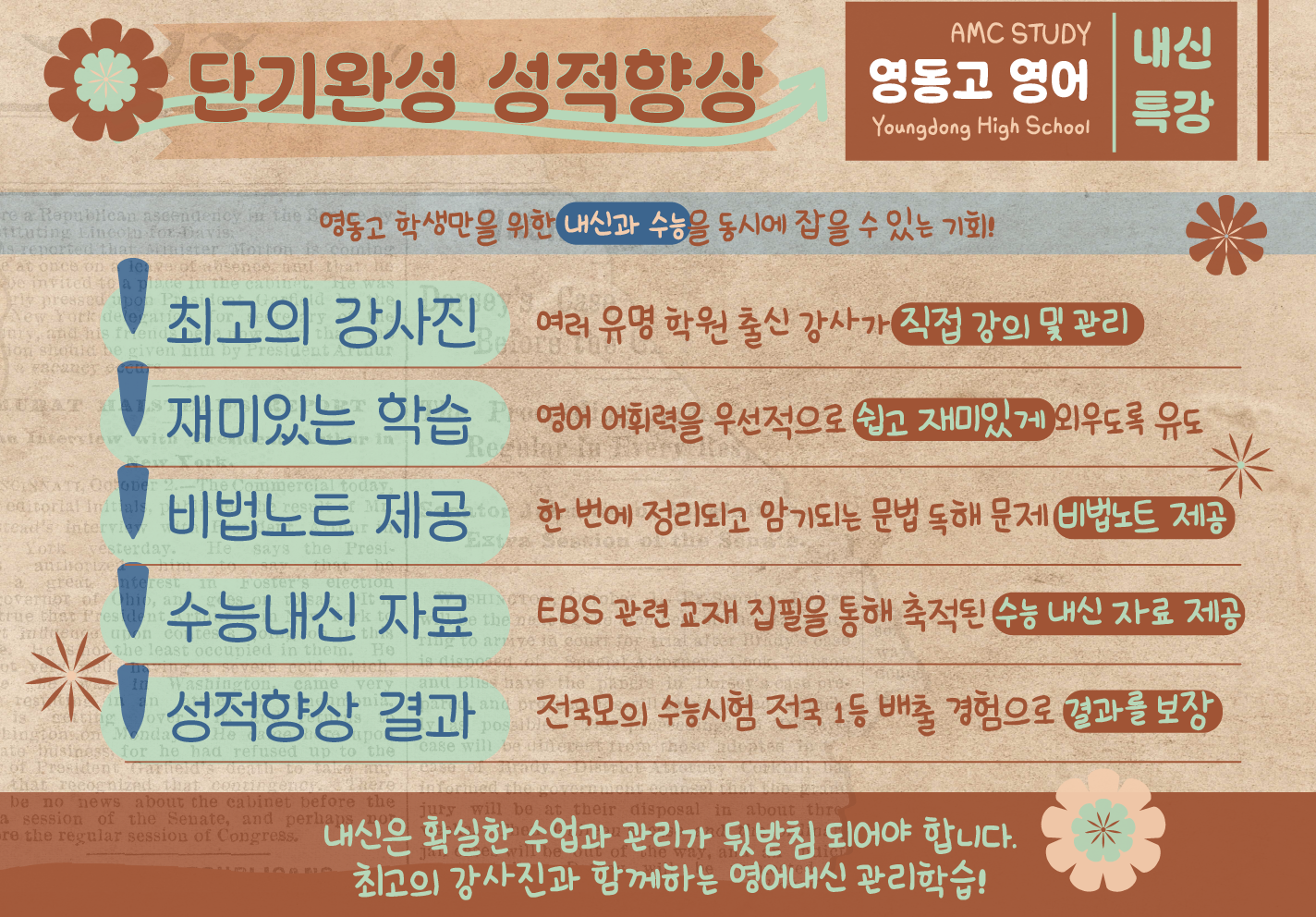 AMC의 내신 특강은 단순히 문제를 풀고 답을 맞히는 수업이 아닙니다. 저희는 영동고