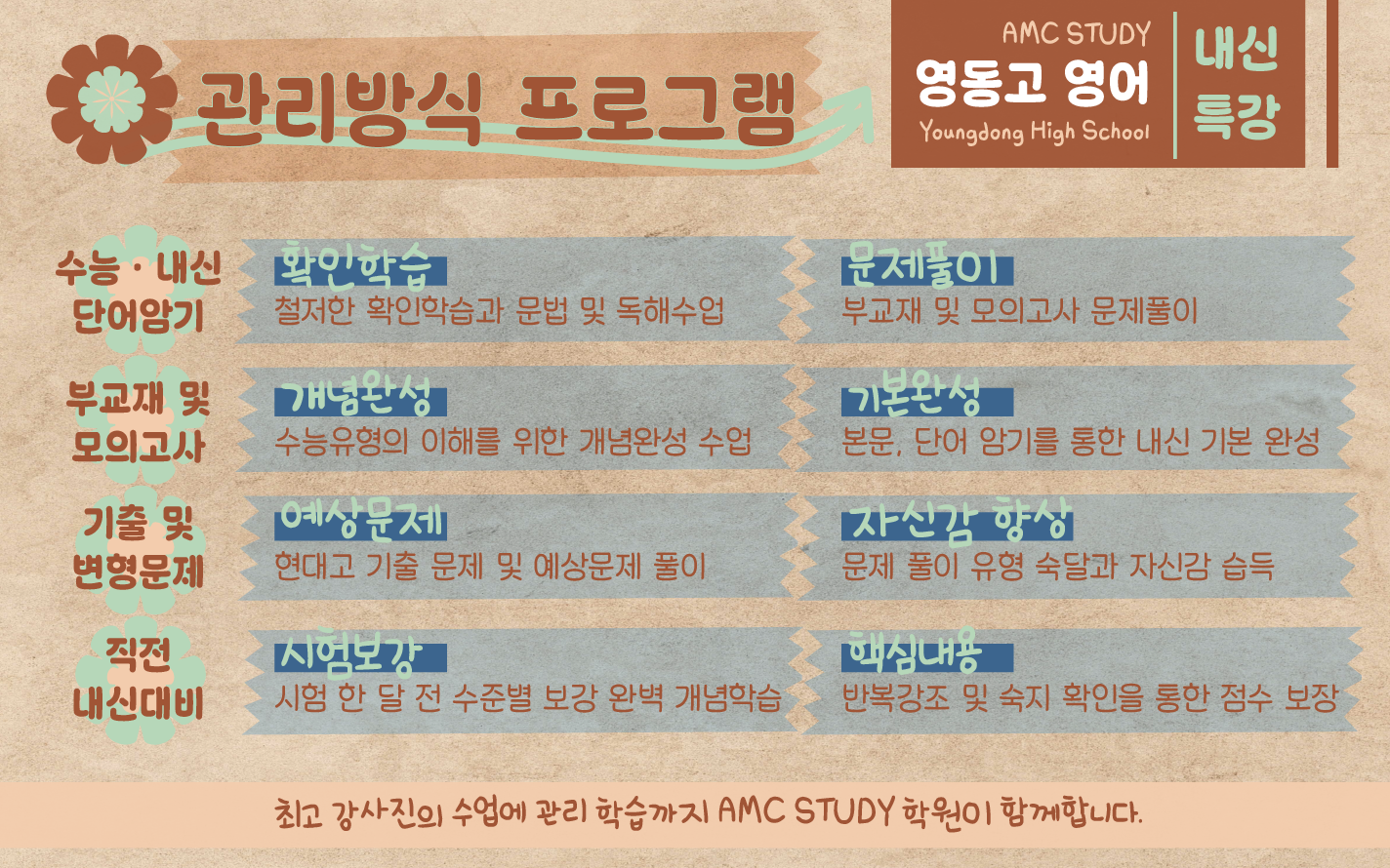 해야만 점수가 오를 수 있습니다. 저희 AMC 영동고 영어 내신 특강은 학생 개개인의 수준과