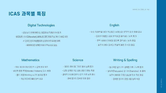 커리큘럼: 호주 유학 준비반, ICAS/AEAS 대비, Math/Science 선행, GAP/GA 사고력 훈련