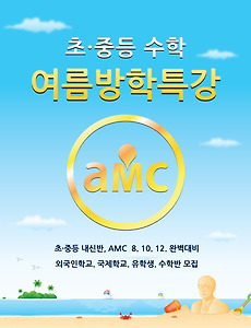 에이엠씨스터디에서는 2011 여름방학을 맞이하여 아래와 같이 수학특강을 계획하였습니다. 개설강의 : 초중등 수학 내신반(선행, 심화 과정), AMC 8, 10, 12 개념완성 및 문제풀이반 모집대상 : 국내 초중등 학생 (초등 4, 5, 6 학년 , 중등 1, 2, 3,학년) 외국인학교 및 국제학교 (APIS, YISS, SIS, KIS, 청라달튼외국인학교, 송도국제학교 채드윅 등) 해외유학생 (FAY School 등 기타 유학생) 특강일정 : 2011년 6 월 ~ 2011년 8 월 까지 (구체적 일정은 전화문의 주세요.) 알찬 여름방학을 보내기 위해 에이엠씨스터디에서는 최선을 다할 것을 약속드립니다. 수업 계획 및 시간표 문의는 전화주세요. [상담 직통] TEL 02. 544. 5124 전화로 방문 예..