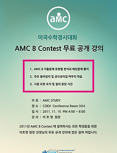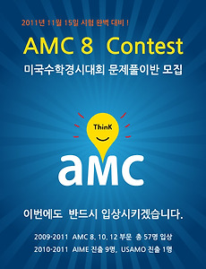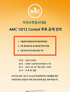 여러분! 어느덧 겨울방학이 다가오고 있습니다. 겨울방학을 맞이하여 에이엠씨스터디에서 방학특강을 개설하였으니 시간표를 보시고 참고하시기 바랍니다. 다들 아시다시피 지난 11월 AMC8 시험을 치뤘는데요. 시험이 끝난후 AMC10/12, AIME 관련 전화문의를 많이 해주셨습니다. 특히 외국에 유학중인 학생 뿐만아니라 국제중, 국제고, 외고, 과학고, 영재고 외 기타 국내 학교 학생들까지도 수업의 개설 여부를 묻는 문의가 많아 많은 고민을 하고 결정을 하였습니다. 시기적으로는 겨울방학동안 2012년 2월,3월에 있을 AMC10, AMC12, AIME를 마무리 해야 할 때 입니다. 이번 방학특강 동안 에이엠씨스터디에서 열심히 마무리 하신다면 2012년 AMC Contest 에서 좋은 결과를 얻을 수 있을 것으..